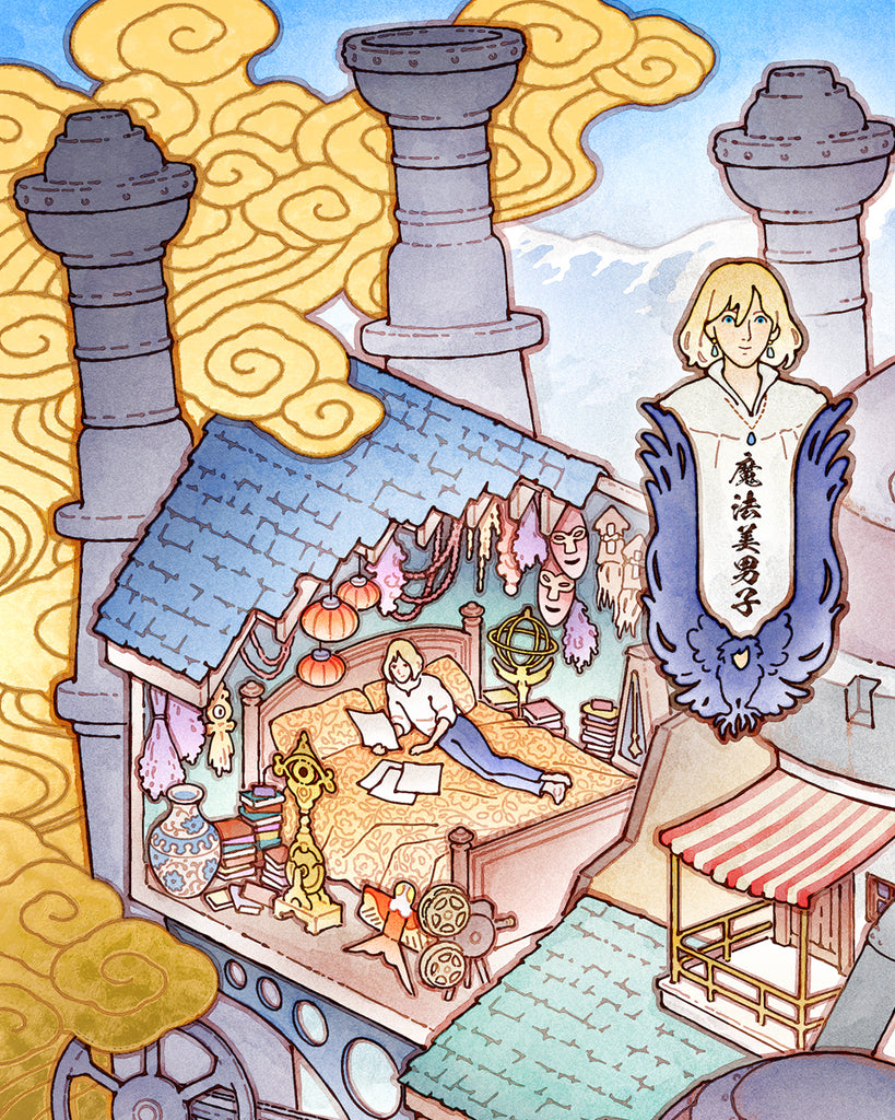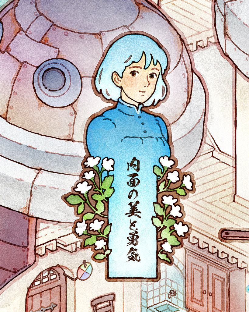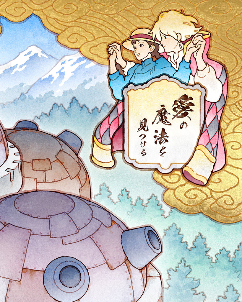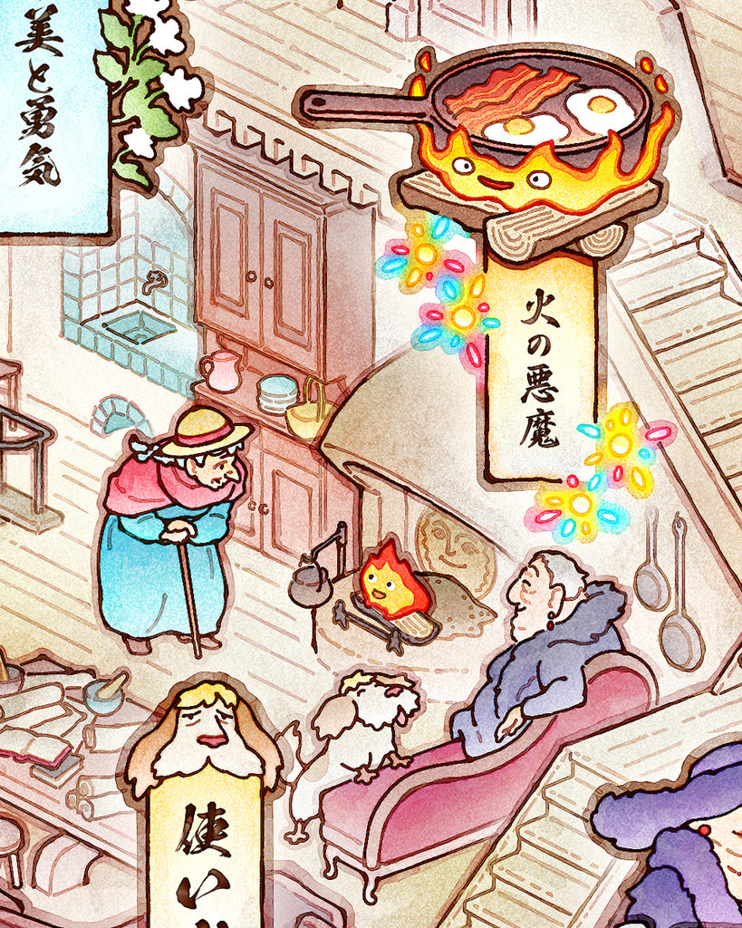 I had a strange, almost religious experience while working on this piece. I had watched the film over and over, to painstakingly reconstruct the castle's interior. Just as I was finishing the artwork, I visited the Ghibli Theme Park in Japan. There, I was allowed to enter the park's reconstruction of Howl's Castle. The real physical reconstruction is incredible - perfect in almost every way. Because I had studied the castle's interior so closely, I knew where every detail should be, and when I looked, there it was! I admit I cried a little, to walk into that magical setting in real life. If you can ever make it to the Ghibli Park, I highly recommend you get inside that castle!