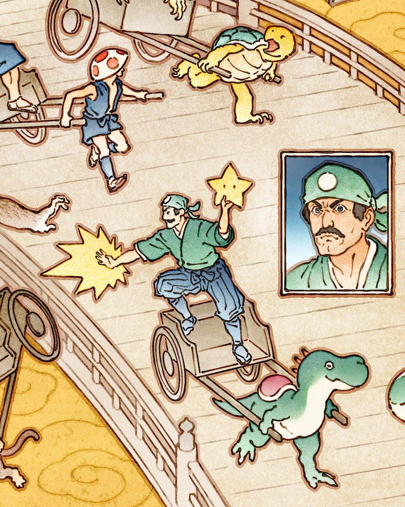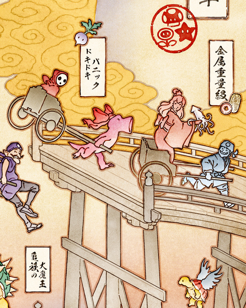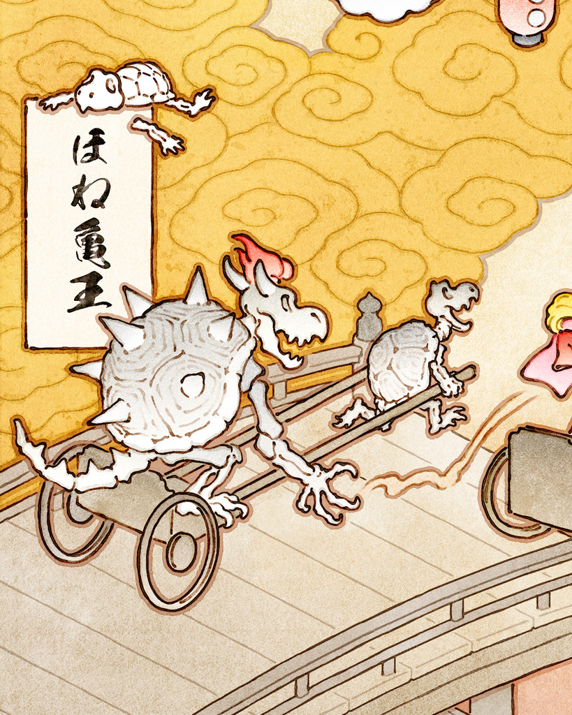 The art style in this print is inspired by Yamaguchi Akira. If you're not familiar with his works, I encourage you to look him up! I tried to include lots of action, humor and detail. I'm very pleased with the results!