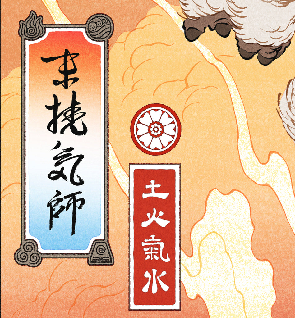 The right cartouche contains the characters 土火気水, which mean 'earth, fire, air, water'.