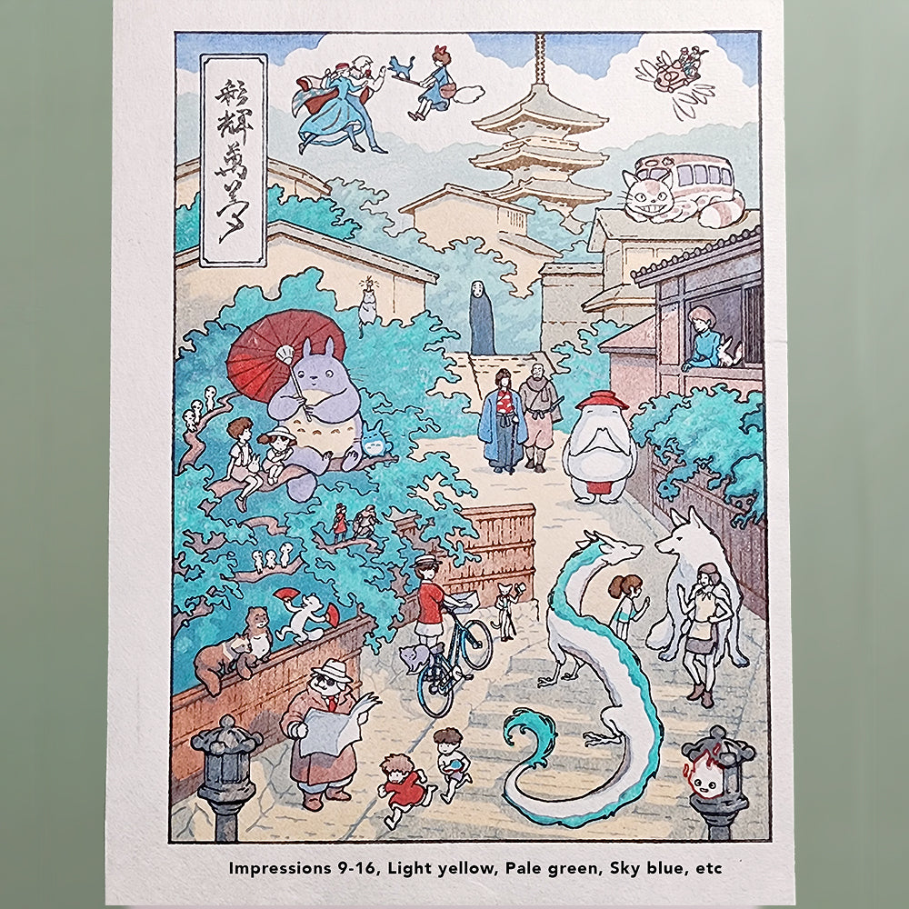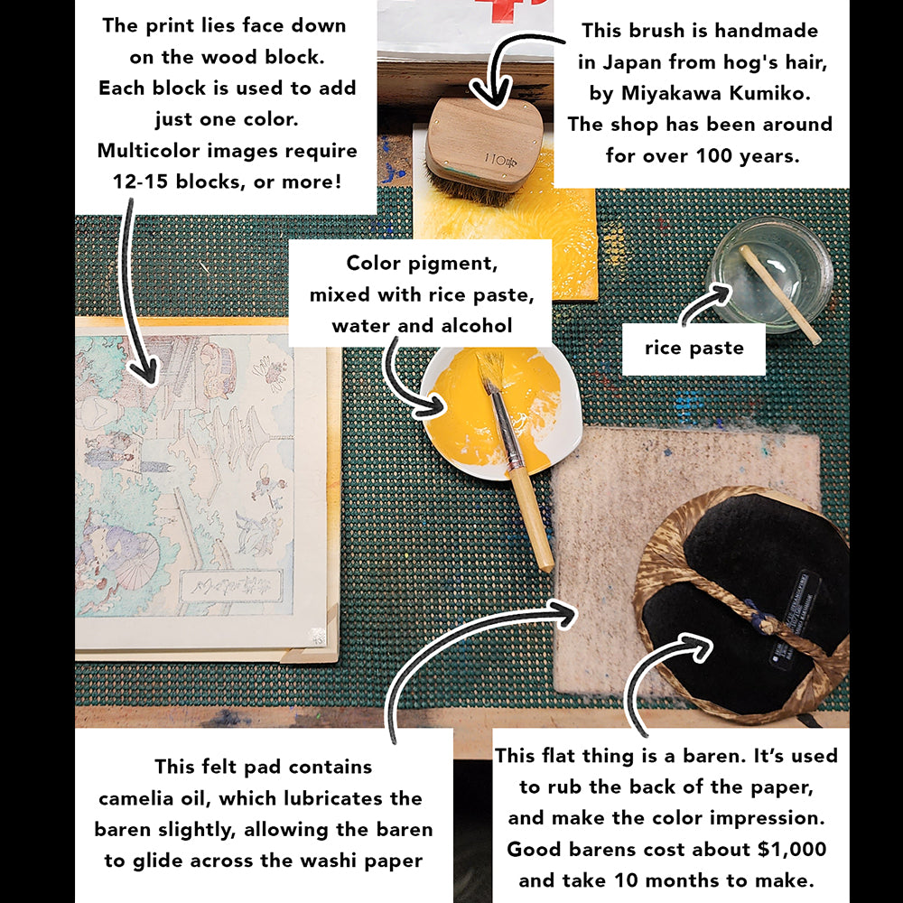 The paper is handmade Echizen Hosho Washi, made by national living treasure, Iwano Ichibei IX. This is the exact same paper printers used over 200 years ago! You can see a video of Mr. Iwano at work here.